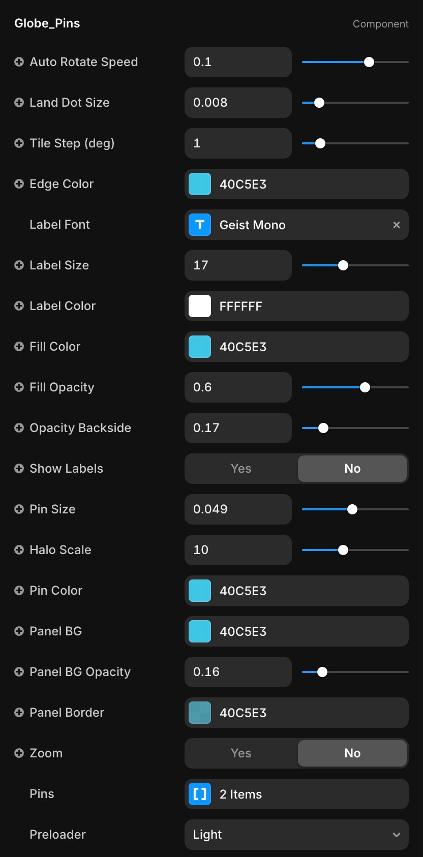 A lightweight Three.js globe that renders countries as shimmering point clouds and lets you place labeled “pins” anywhere on Earth. Designed for Framer, it balances visual polish with strict GPU/CPU budgeting, so it feels smooth in both the canvas and on published sites. Please search your LON/LAT coordinates in the web.